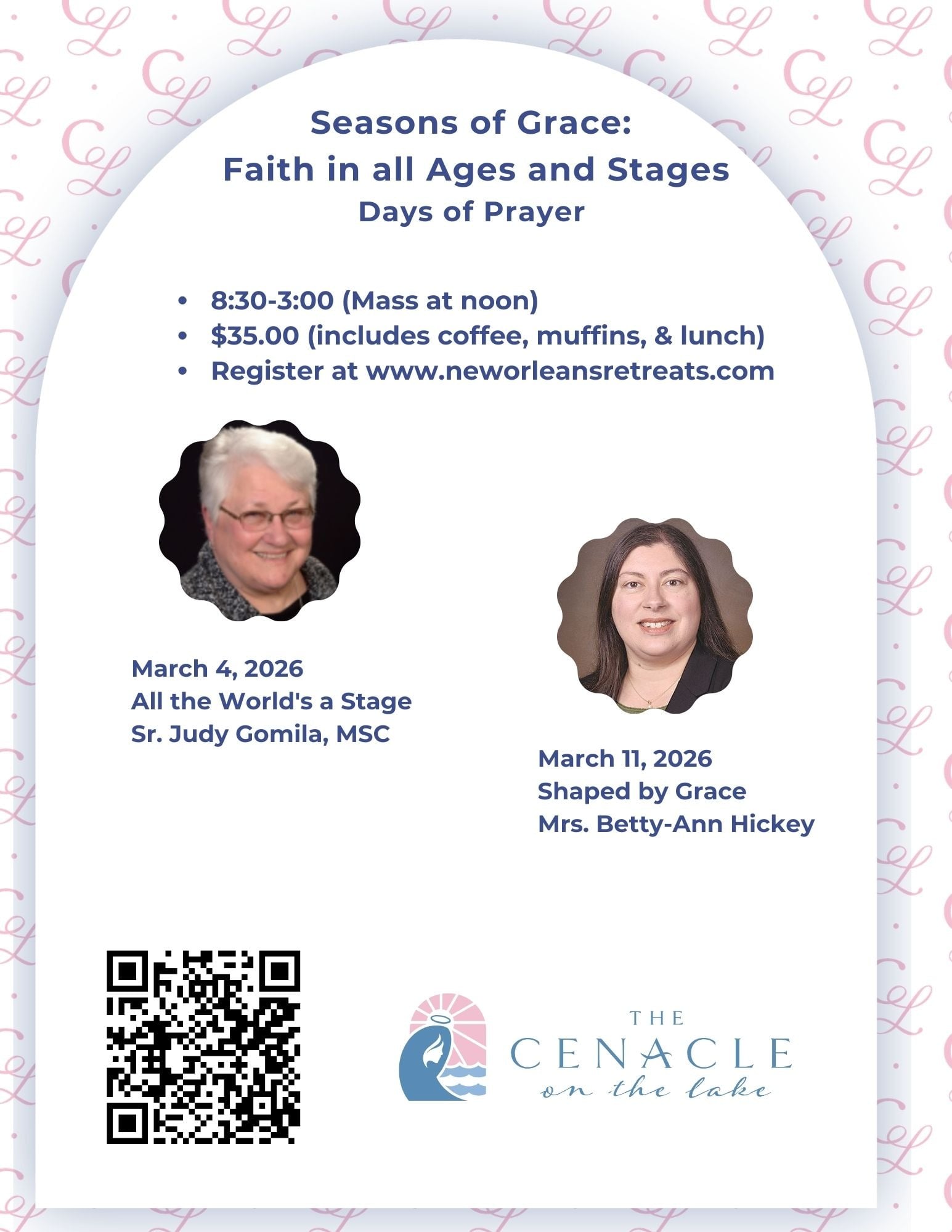 Each time I have attended a retreat at the Cenacle on the Lake, I am reminded of the special care given to my birth mother by the Cenacle Sisters back then, and to me by the staff of this very special place. Over the span of 62 years, it has brought us both closer to God and each other." – Alison Guerra